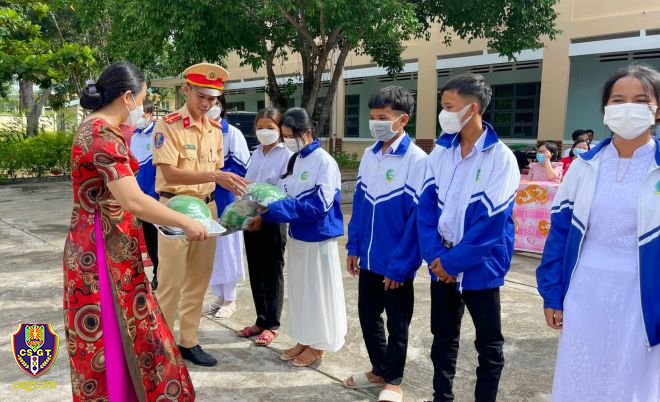 Tại buổi lễ, đơn vị cũng trao tặng 1.140 quyển vở, 55 mũ bảo hiểm để động viên tinh thần và khuyến khích, cổ vũ các em nâng cao ý thức chấp hành pháp luật giao thông.