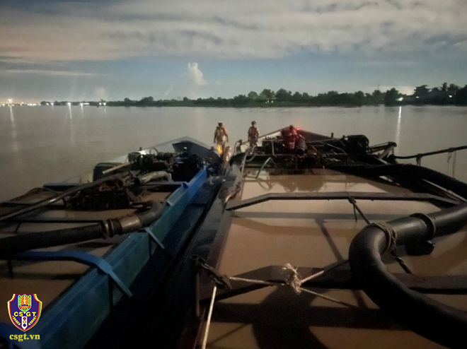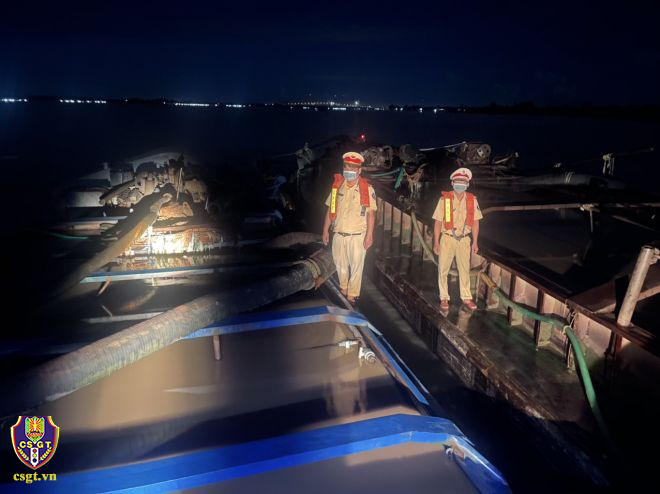 Theo đó, lúc 02h50 phút, ngày 15/6, trên tuyến Sông Tiền, thuộc thủy phận ấp Tân An, xã An Nhơn, huyện Châu Thành, tỉnh Đồng Tháp. Tổ công tác thuộc Phòng Cảnh sát giao thông phối hợp với Công an huyện Châu Thành phát hiện, bắt quả tang 02 vụ, 04 đối tượng (Huỳnh Tuấn Kiệt, sinh năm 2000, ngụ ấp Ấp 4, xã Bình Xuân, thị xã Gò Công, tỉnh Tiền Giang và Hồ Nhật Nam, sinh năm 1999, ngụ Ấp 4, xã Vĩnh Hòa, huyện Ba Tri, tỉnh Bến Tre; Nguyễn Quốc Thái, sinh năm 1992, ngụ ấp Phú Mỹ, xã Đồng Phú, huyện Long Hồ, tỉnh Vĩnh Long và Lê Thanh Thư, sinh năm 1992, ngụ Ấp Phú Thành 3, xã Đồng Phú, huyện Long Hồ, tỉnh Vĩnh Long) sử dụng 02 phương tiện xà lan biển số TG-14171, số đăng kiểm VR16041172, trọng tải khoảng 149 tấn; công suất khoảng 150CV và tàu mang biển số TG-14453, số đăng kiểm VR17049485 trọng tải khoảng 190 tấn; công suất khoảng 200CV đang khai thác cát trái phép từ lòng sông lên phương tiện.