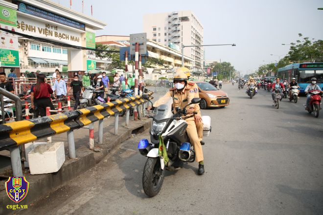 Các mô tô chuyên dụng cùng cán bộ, chiến sĩ liên tục tuần tra tuyến vào khung giờ cao điểm buổi sáng và chiều. Lực lượng này sẽ nhanh chóng phối hợp cùng đội địa bàn gỡ nút ùn tắc, xử lý tình huống sự cố, tai nạn giao thông…