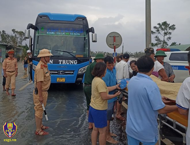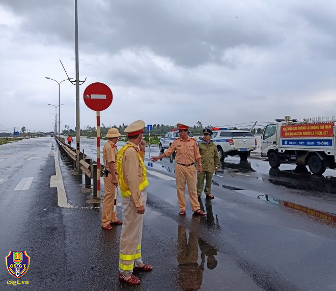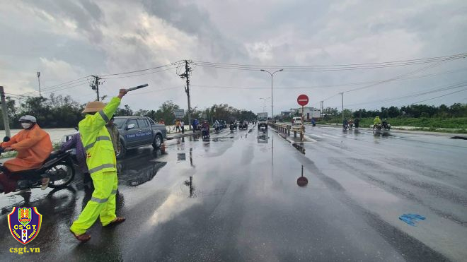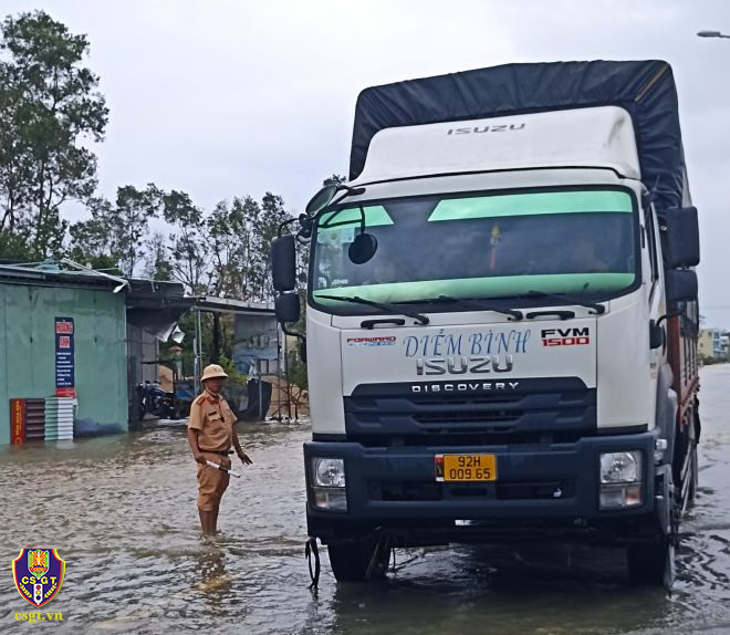CSGT đã hướng dẫn các phương tiện di chuyển bằng các tuyến đường phù hợp, ngăn cản người dân tự ý băng qua các điểm ngập để đảm bảo an toàn cho người, phương tiện. Tại điểm Quốc lộ 1 đoạn giao nhau với đường dẫn xuống Khu công nghiệp Tam Thăng, nước tràn qua đường, có điểm ngập sâu xấp xỉ 0,5m. Để đảm bảo an toàn cho người, phương tiện qua lại khu vực này, Đội CSGT số 1 đã bố trí thêm tổ công tác, huy động cán bộ chiến sĩ điều tiết, hướng dẫn phân luồng cho các phương tiện đi lại an toàn.