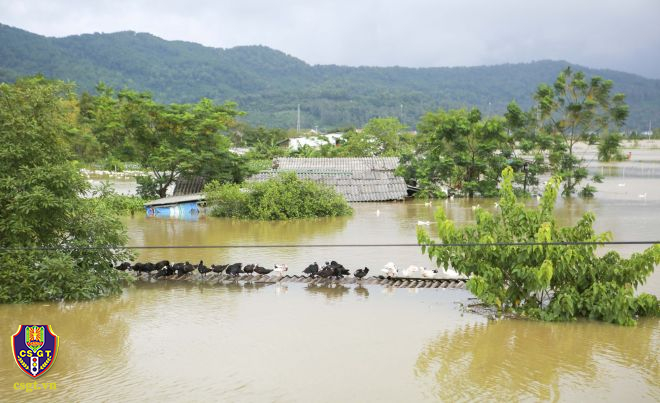 Nước ngập sâu, có nơi chỉ còn nhìn thấy nóc nhà. Đỉnh nóc nhà là nơi trú cho đàn vịt của các hộ dân chăn nuôi khi nước dâng cao.