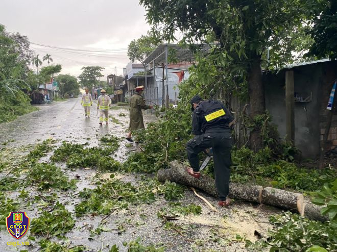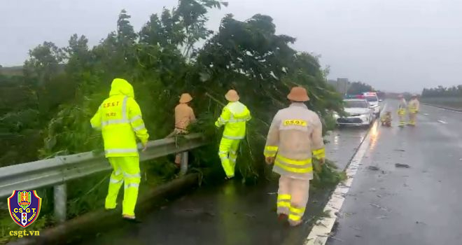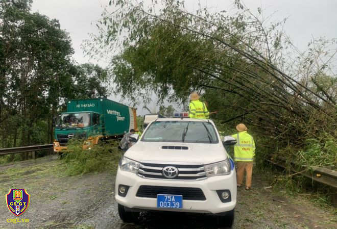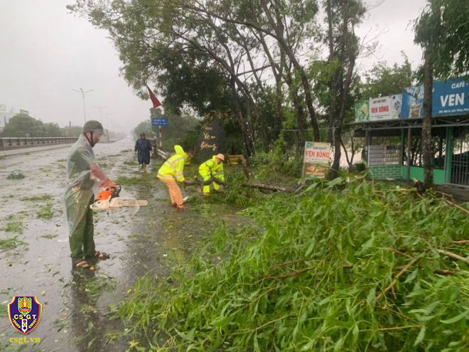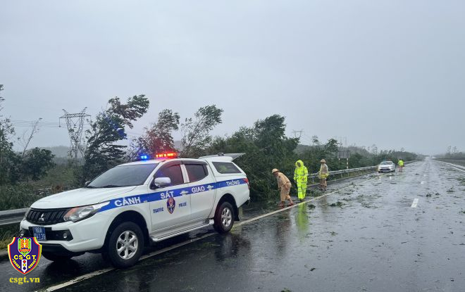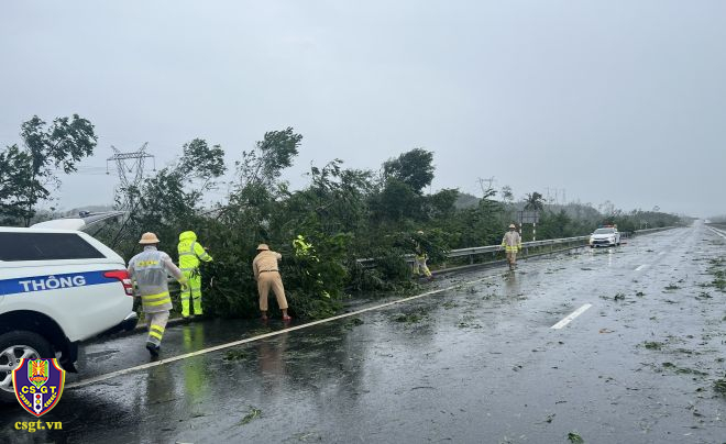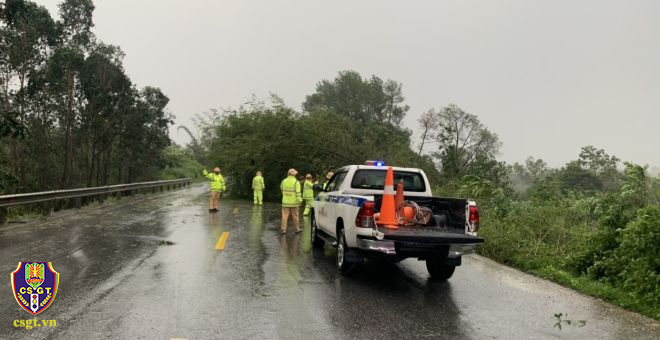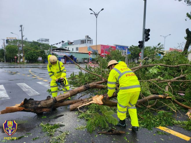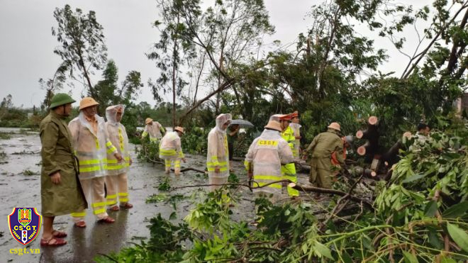 Ghi nhận tại một số tuyến đường giao thông bị đất đá đổ ra đường, cây xanh đổ khiến giao thông bị cản trở. Trước những hậu quả bão để lại, lực lượng CSGT thuộc Cục CSGT và một số tỉnh miền Trung như Đà Nẵng, Quảng Ngãi, Thừa Thiên Huế, Quảng Trị, Quảng Nam… đã bố trí 100% lực lượng bám tuyến 24/24h, hiện tại lực lượng CSGT đang tiến hành dọn đất đá, cây xanh bị đổ, hệ thống biển báo hiệu giao thông bị hư hỏng để bảo đảm TTAGT trên các tuyến giao thông…