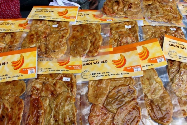 Món chuối ép, sấy của cô Trinh cũng dựa trên cách chế biến truyền thống của các bà, các mẹ, song đặc biệt ở chỗ là những miếng chuối ép sấy vàng ươm màu vàng của mật chuối, vừa mềm dẻo, vừa có độ dai, khô ráo, thơm phức lại thêm tẩm mè rang, gừng tươi đúng công đoạn nên khi ăn, từng miếng chuối mềm dẻo mang hương vị của mè rang, gừng tươi, khiến người ăn cảm thấy thú vị.