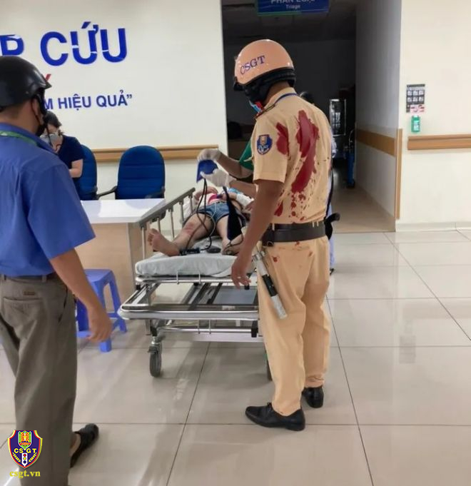 Ngay lập tức, có hai cán bộ thuộc Đội Cảnh sát giao thông (CSGT) Rạch Chiếc (Phòng CSGT Công an TPHCM) đang làm nhiệm vụ gần đó, một cán bộ đã cùng người dân hỗ trợ đưa nạn nhân lên xe chuyên dụng chở vào Bệnh viện Ung Bướu để cấp cứu; cán bộ còn lại đứng bảo vệ hiện trường.
